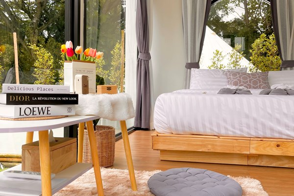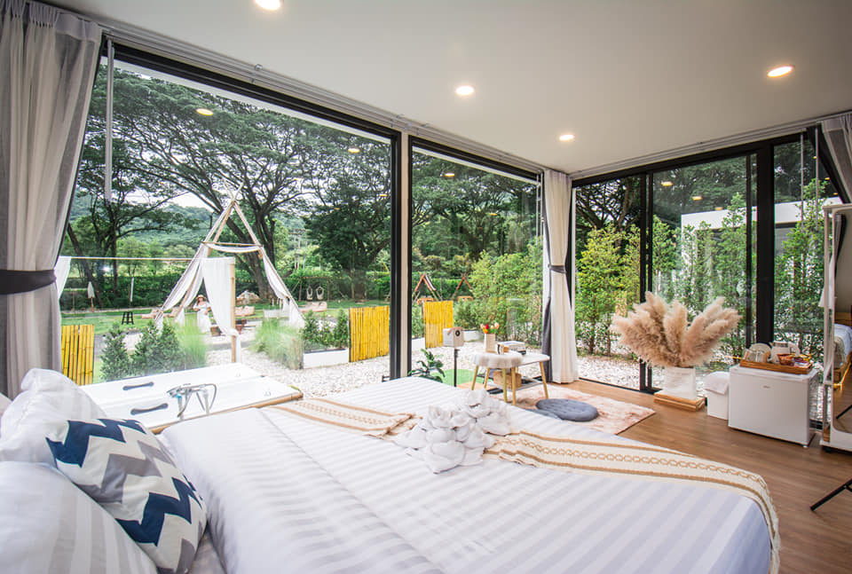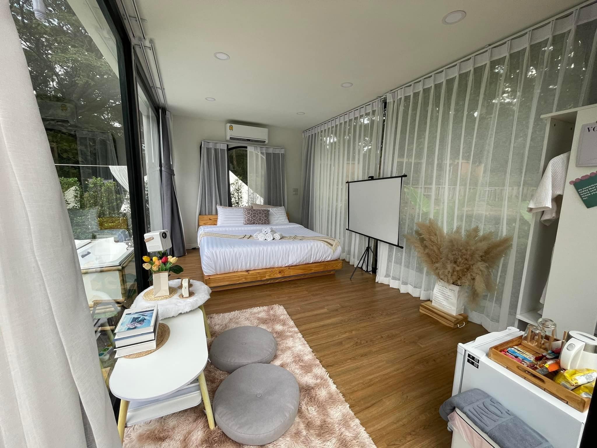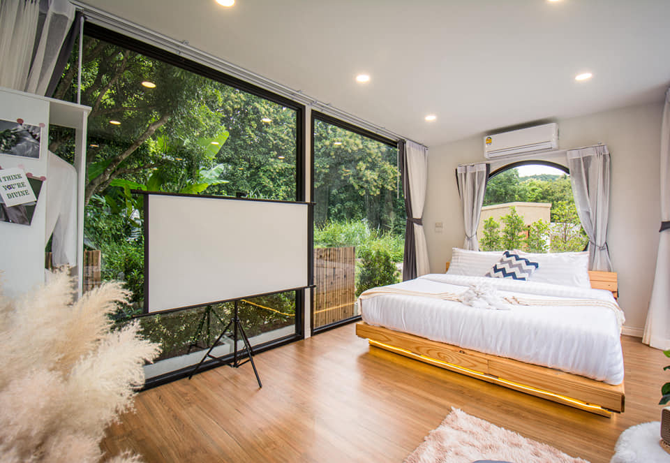 เตียงขนาด 6 ฟุต ให้คุณได้เอนกายพักผ่อนและสนุกเต็มที่กับจอฉายโปรเจคเตอร์ที่สามารถรับชม Netflix ,Youtube ,โปรแกรมอื่นๆ แบบส่วนตัวได้ตลอดทั้งคืน